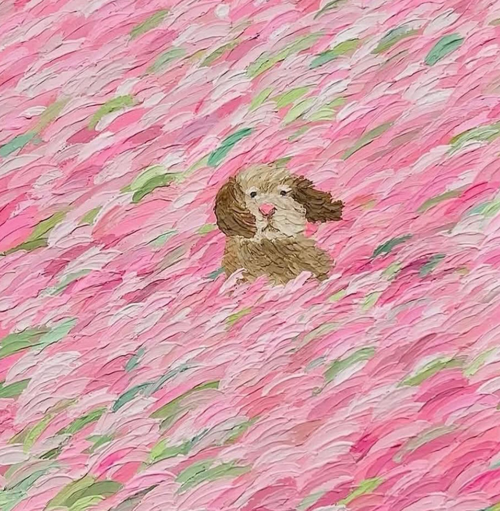 Quando mi è apparso il quadro rosa con il cane beige di Young Lee ho sorriso e pensato, ma cos’è davvero la realtà?